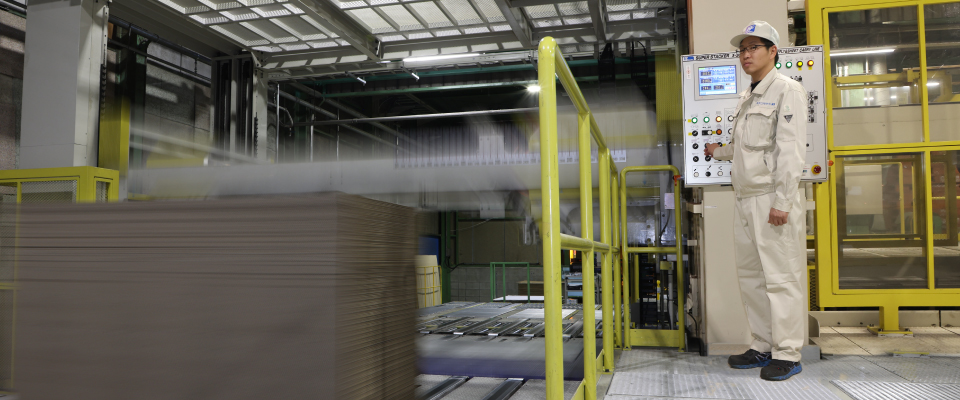 ダンボールシートを製造するコルゲートマシンのスリッタースコアラ(ダンボールシートを切断して罫線を入れる工程)を担当。リーダーとしてチームを牽引し、機械メンテナンス等のスケジュール管理や現場スタッフの声を聞いて職場改善に取り組む。